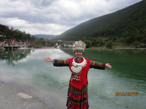 蓝月谷位于玉龙雪山脚下,其前身是早为人们所熟知的“白水河”,因在晴天时,水的颜色呈蓝色,而且山谷呈月牙形,因此得名蓝月谷。蓝月谷中我们身穿云南特色的民族服装,仿佛如置身幻境之中。